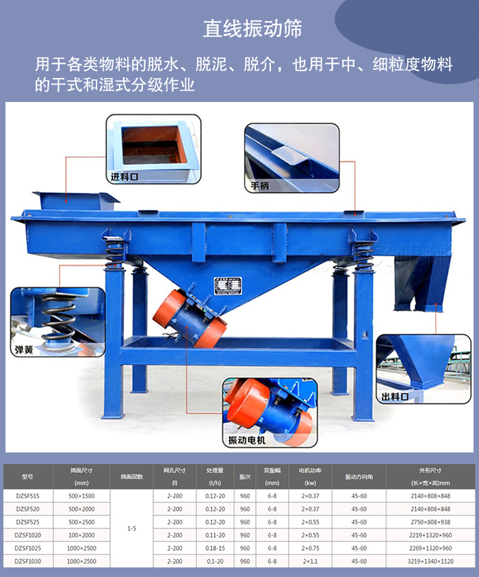 直線振動篩篩箱的運動軌跡為直線或接近直線,它有兩個軸,所以又稱雙軸振動篩。直線振動篩水平或傾斜安裝,這類振動篩結(jié)構(gòu)緊湊,運行平穩(wěn),被廣泛用于各類物料的脫水、脫泥、脫介,也用于中、細粒度物料的干式和濕式分級作業(yè)。我廠生產(chǎn)的直線振動篩種HZSF型號就是直線振動篩代表性的產(chǎn)品。