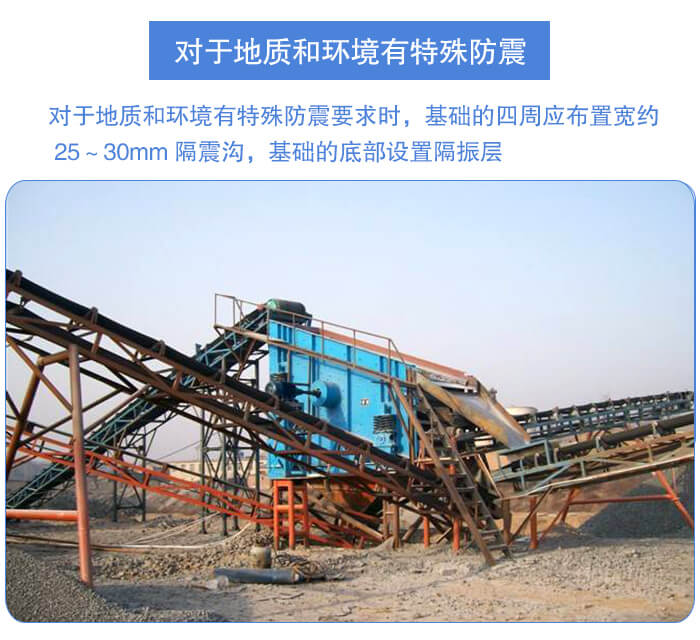 對于地質(zhì)和環(huán)境有特殊防震要求時(shí),基礎(chǔ)的四周應(yīng)布置寬約 25~30mm 隔震溝,基礎(chǔ)的底部設(shè)置隔振層,基礎(chǔ)底部夯實(shí)之后,用水泥、煤渣、瀝青鋪設(shè)厚度約 200mm,在此隔振層上再澆灌混凝土。