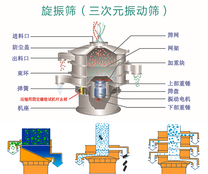 旋振篩又名(三次元振動篩)的外形結(jié)構(gòu)可以分為:進(jìn)料口、防塵蓋、篩網(wǎng)、網(wǎng)架、出料口、束環(huán)、彈簧、篩盤和底座;