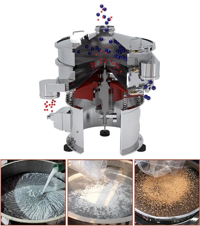氣旋篩使用一組槳葉將產(chǎn)品推出篩網(wǎng)圓柱體,高速旋轉它們并對產(chǎn)品施加離心力,圓柱體水平安裝,因此對槳葉施加輕微的扭轉以將產(chǎn)品沿著圓柱體的長度向下移動,并且使用螺旋鉆以穩(wěn)定的速度喂入槳葉。與振動篩相比,這些槳葉迫使產(chǎn)品通過篩網(wǎng),從而使它們具有更高的吞吐量,旋轉螺旋鉆和槳葉組件的運動具有分解塊或分離壓實產(chǎn)品的額外好處。