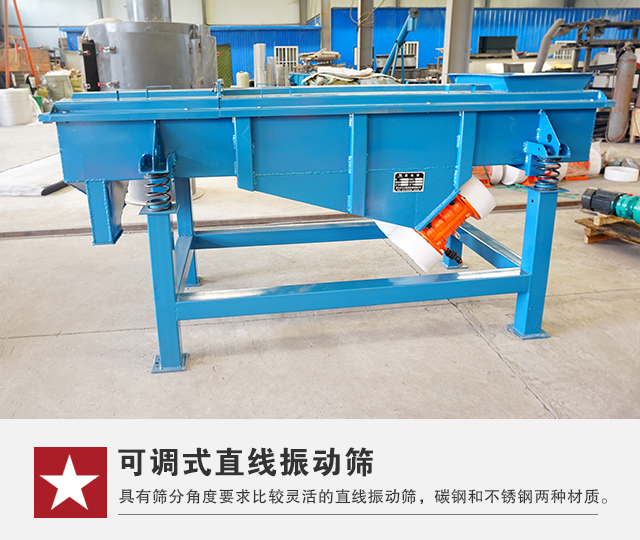 該設(shè)備主要是針對(duì)一些對(duì)直線振動(dòng)篩篩分角度要求比較靈活的直線振動(dòng)篩,該設(shè)備有碳鋼和不銹鋼兩種材質(zhì)進(jìn)行選擇。