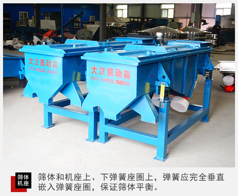 2、篩體和機(jī)座上、下彈簧座圈上,彈簧應(yīng)完全垂直嵌入彈簧座圈,以保證篩體平衡,篩機(jī)的振動(dòng)部分切勿與機(jī)外其它物體有硬性連接或接觸。