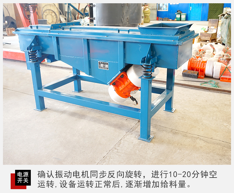 3、閉合電源開(kāi)關(guān),確認(rèn)振動(dòng)電機(jī)同步反向旋轉(zhuǎn),進(jìn)行10-20分鐘空運(yùn)轉(zhuǎn),設(shè)備在運(yùn)行時(shí)如有異常聲音,應(yīng)迅速關(guān)機(jī)進(jìn)行檢查處理。設(shè)備運(yùn)轉(zhuǎn)正常后,可將少量需篩分的物料通過(guò)進(jìn)料口設(shè)入篩機(jī)內(nèi),確認(rèn)物料向出料口方向行進(jìn),然后逐漸增加到所需和所能承受的給料量。