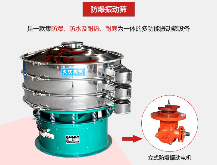 防爆振動篩是針對一些易產生爆炸行業(yè)的研發(fā)設計而成,是一款集防爆、防水及耐熱、耐寒特殊要求的場合為一體的多功能振動篩設備,能夠實現該功能主要原因是防爆振動篩采用的是立式防爆振動電機。