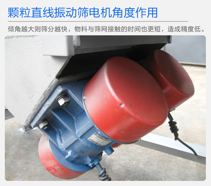 顆粒直線振動篩電機(jī)的安裝角度是可以調(diào)整的,角度不一樣,其產(chǎn)生的振幅大小也不一樣,一定傾角的直線振動篩,可以有效的提高篩分產(chǎn)量,增大生產(chǎn)效率,傾角越大,則篩分越快,物料與篩網(wǎng)接觸的時間也更短,則篩網(wǎng)使用年限也會增加,角度過大。則容易造成篩分精度達(dá)不到,影響篩分質(zhì)量,所以顆粒直線振動篩的振動電機(jī)在安裝時,角度的選取很重要,客戶在開機(jī)使用直線振動篩前,應(yīng)根據(jù)生產(chǎn)需求,調(diào)整好角度,一般直線振動篩廠家在篩機(jī)出廠前,將其角度調(diào)整為45度。